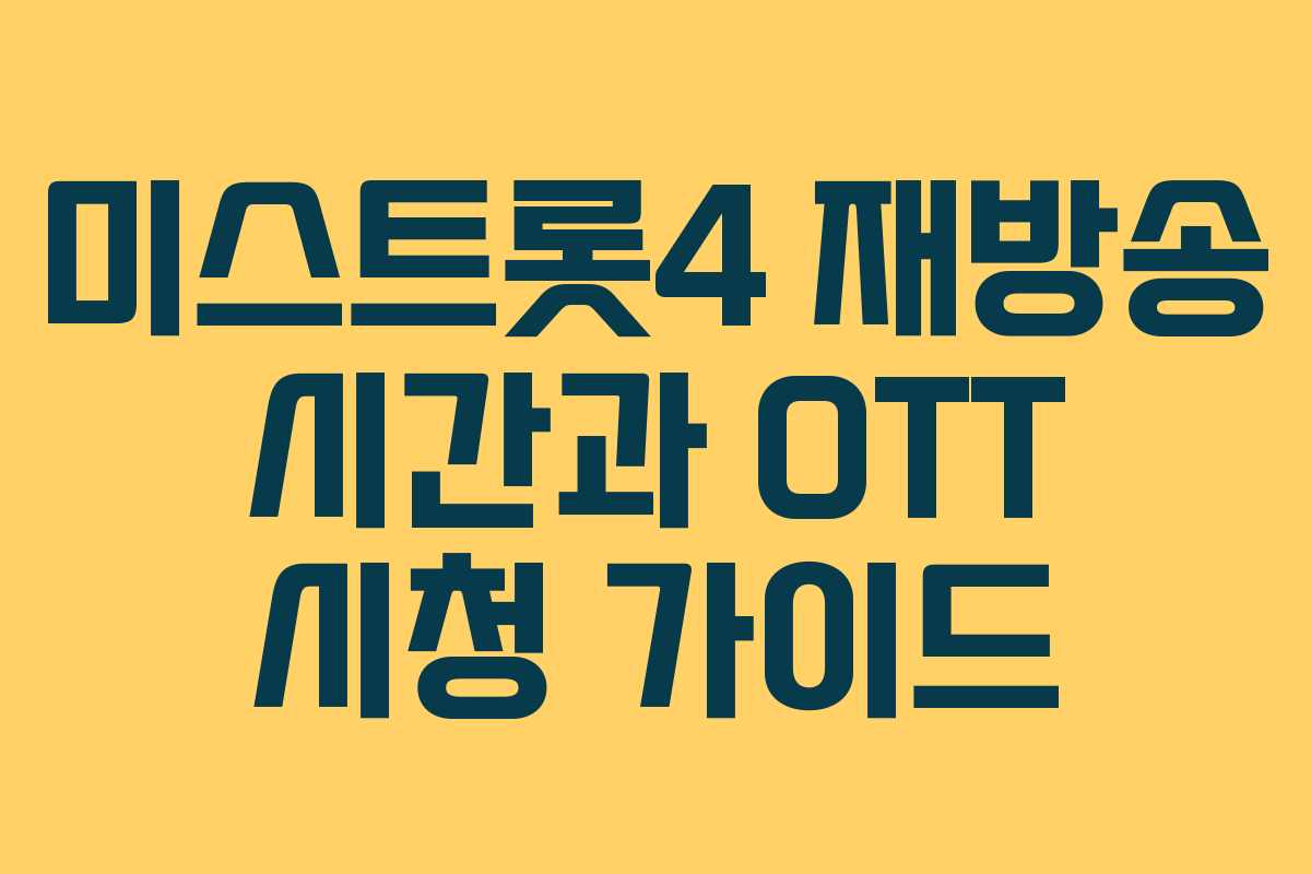 미스트롯4는 매주 목요일 저녁 10시에 TV조선에서 방영되는 인기 경연 프로그램으로, 많은 이들이 이 프로그램을 통해 감동과 즐거움을 경험하고 있습니다. 본 방송을 놓치는 경우가 많아 재방송 시간을 확인하는 것이 중요하므로, 본 글에서는 미스트롯4의 재방송 시간과 OTT 시청 방법을 정리하였습니다.