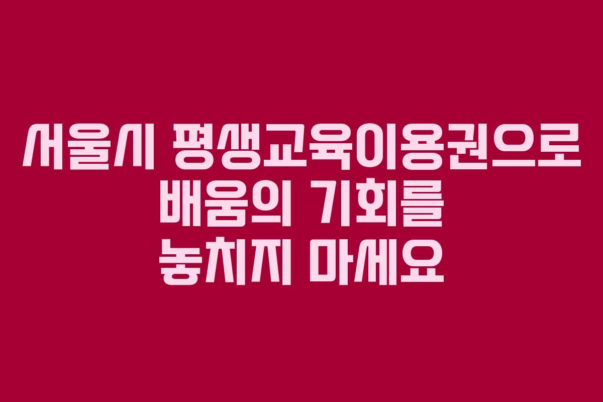 서울시 평생교육이용권은 이제 배움에 대한 갈망을 가진 모든 이들을 위한 든든한 지원책입니다. 연 최대 35만 원의 지원금으로 다양한 교육기관에서 수업을 받을 수 있으며, 누구나 신청할 수 있는 자격을 갖추고 있다면 이 기회를 놓치지 말아야 합니다. 배움의 기회를 미루지 말고, 지금 바로 신청하여 보다 풍성한 배움의 여정을 시작해 보세요.