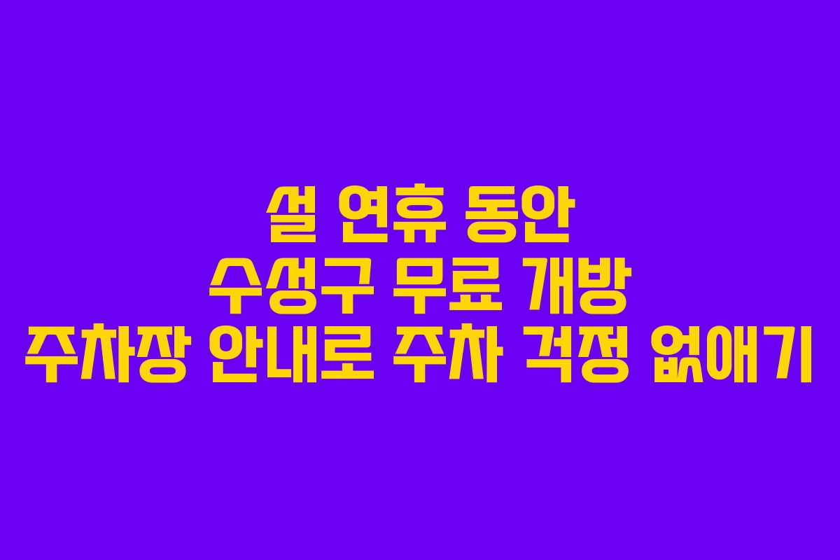 설 연휴를 맞아 고향에 돌아오는 귀성객들과 지역 주민들을 위해 수성구에서 무료로 개방되는 주차장 리스트를 정리하였습니다. 이 정보는 수성구청에서 제공하며, 주차 공간 부족으로 인한 불편을 해소하기 위해 마련된 것입니다. 이제 주차 걱정 없이 편안한 연휴를 즐기시기 바랍니다.