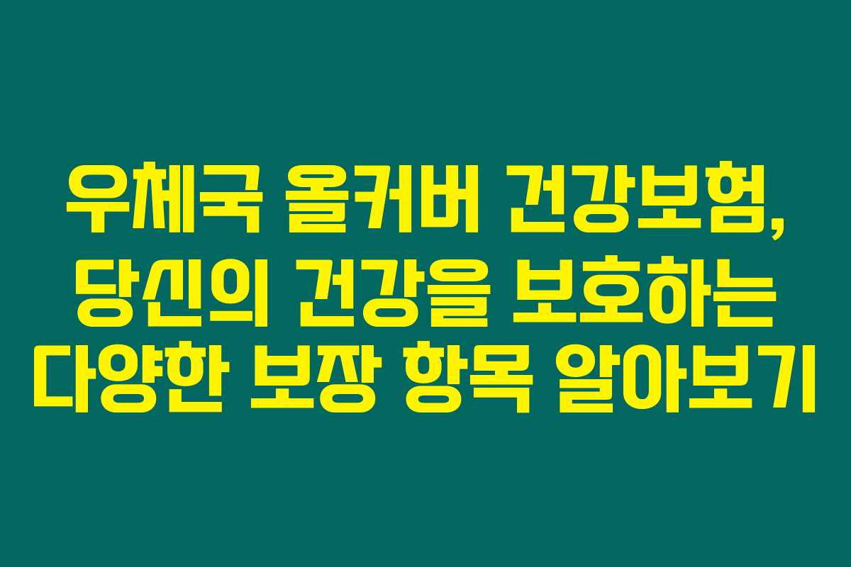 우체국 올커버 건강보험은 암과 심장병, 사고 등 다양한 질병으로부터 경제적 안전망을 제공하는 필수 보험이에요. 여러 보장 항목과 함께 가입 방법까지 쉽고 간편하게 설명해 드릴게요. 아래를 읽어보시면 보다 나은 선택을 할 수 있을거에요.