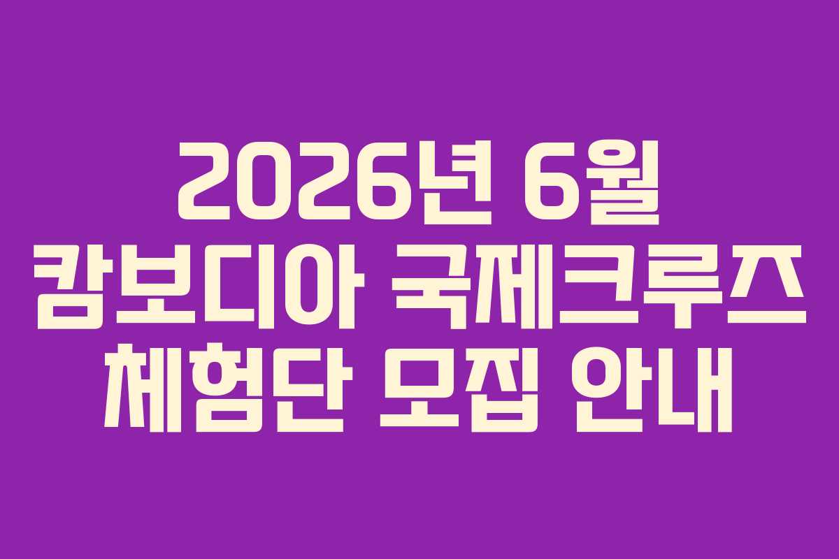 2026년 6월 캄보디아 국제크루즈 체험단은 특정 기간 동안 모집이 이루어집니다. 모집 대상은 여행을 사랑하고, 새로운 경험을 추구하는 모든 이들입니다. 저 역시 처음 크루즈를 선택했을 때, 많은 고민을 했던 기억이 납니다. 하지만 모집에 참여한 후, 그 선택이 얼마나 값진 경험이었는지 깨달았습니다.